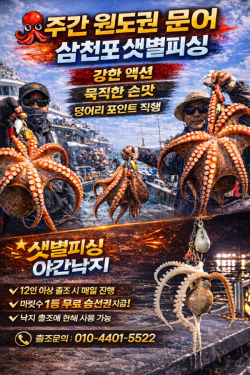 #샛별피싱#원도권문어 #야간낙지 #출조정보#주말일정내일 출항확정입니다!!왕대가리 손맛보러 달려봅시다요~~몇자리 여유 있으니 연락주세요~~출조시간 06시~16시까지선비 평일8만원 /주말9만원♡ 문어 이벤트 마릿수 장원 다이와 태클박스 (12인 이상시 이벤트 적용 됩니다)https://morningstar.sunsang24.com/[밴드 초대장]샛별피싱사무장 010-4401-5522님이 당신을 '삼천포 샛별피싱' 밴드에 초대합니다.초대를 수락하고 우리 모임에 함께해요!https://band.us/n/afabb5f4o3h93=== 샛별피싱 예약안내 ===예약문의 :010-4401-5522오시는길 :경남 사천시 대방동 251-